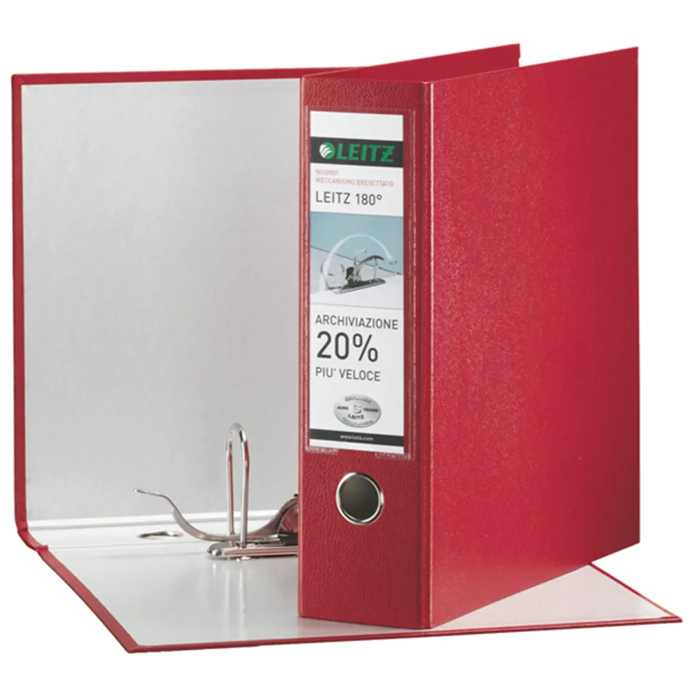 Registratore Leitz 180° dotato di una resistente struttura in cartone da 2,4 mm rivestito in polipropilene con finitura similpelle. L'innovativo meccanismo Leitz 180° consente una piu' ampia apertura degli anelli facilitando l'inserimento dei documenti. L'apertura della leva con un angolo di 180° rende possibile l'archiviazione dei fogli da entrambi i lati. Solida custodia rivestita in cartagoffrata con grafica bicromatica. Formato utile 23x33 cm, dorso 8 cm.
