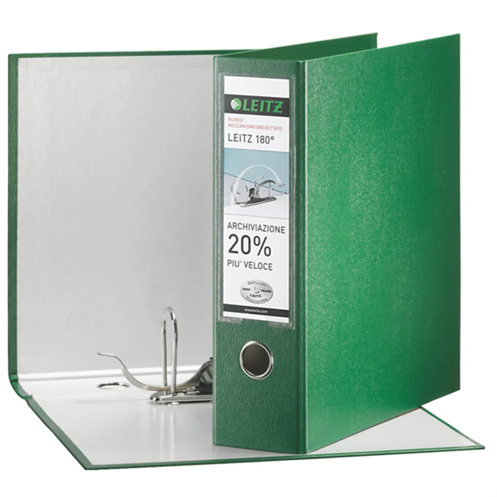 Registratore Leitz 180° dotato di una resistente struttura in cartone da 2,4 mm rivestito in polipropilene con finitura similpelle. L'innovativo meccanismo Leitz 180° consente una piu' ampia apertura degli anelli facilitando l'inserimento dei documenti. L'apertura della leva con un angolo di 180° rende possibile l'archiviazione dei fogli da entrambi i lati. Solida custodia rivestita in cartagoffrata con grafica bicromatica. Formato utile 23x33 cm, dorso 8 cm.
